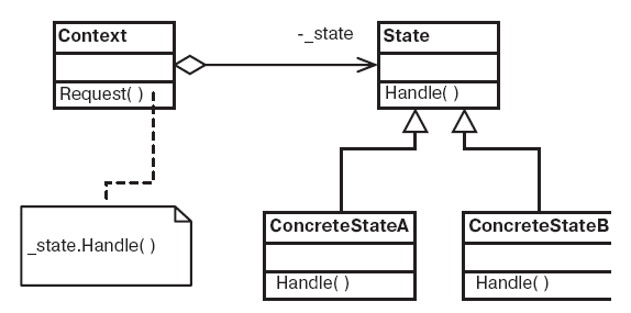 Идея заключается в том, чтобы инкапсулировать разные состояния в виде отдельных классов (см. ConcreteStateA и ConcreteStateB). Эти классы конкретных состояний наследуют от класса State. У класса Context имеется экземпляр в виде поля, и когда он получает вызов метода запроса Request(), то вызывает метод обработки Handle() экземпляра состояния. Метод Handle() по-разному реализуется для классов различных состояний.
