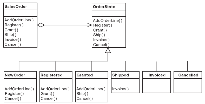 Кроме того, имеются отличия в поведении в зависимости от конкретного состояния. Так, в состоянии Cancelled нельзя вызвать метод AddOrderLine(), чтобы ввести в заказ дополнительные позиции (это же, кстати, относится и к состояниям Shipped и Invoiced).