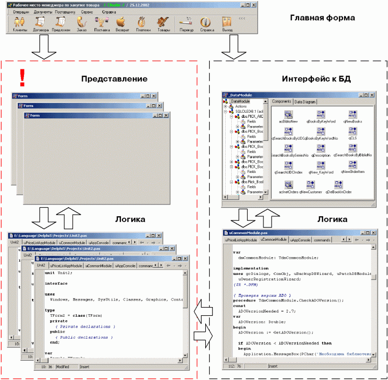 На рисунке 1 показана типичная архитектура построения приложения. Как видите, примеры приведены на Delphi. Поэтому следует оговориться, что здесь и далее «модулем» мы будем называть любого наследника TDataModule. При такой архитектуре существует главная форма (независимо от типа интерфейса – MDI или SDI), один или более модуль данных и множество визуальных форм. При этом логика расположена произвольно, как в главной форме, так и в модулях данных и конкретных формах. Область видимости при этом для конкретных модулей ничем не регламентирована, что приводит к избыточной связности.