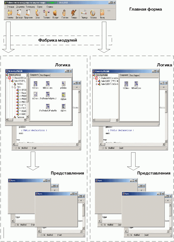 Как видно из рисунка 2, главная форма изолирована от множества форм, которые реализуют уровень представления для конкретных бизнес-функций. Она «видит» только множество модулей, на которые разбита вся программа. Сами модули не «видят» друг друга. Они инкапсулируют в себе всю логику создания и вызова форм.