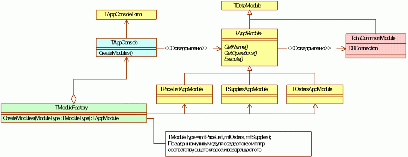 На рисунке 3 показана диаграмма классов «скелета» проекта. Главный модуль (TAppConsole) создает множество модулей через абстрактную фабрику TModuleFactory. Кроме этого TAppConsole создает экземпляр TAppConsoleForm – главного окна программы.