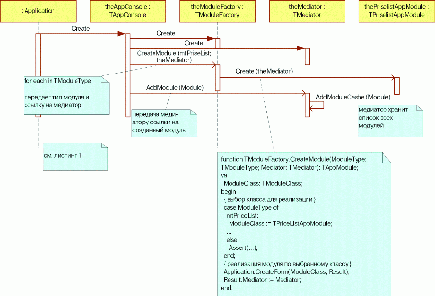 При запуске приложения сначала создается AppConsole (Singleton), которая в свою очередь создает theMediator (Singleton) и theModuleFactory (Singleton). Затем в цикле создаются модули, посредством вызова функции CreateModule, в которой один из параметров имеет тип модуля (TModuleType), а второй – это ссылка на Медиатор. Перечисление TModuleType = (mtPriceList, mtClients,…) необходимо для фабрики модулей, которая должна знать, когда и какой модуль передавать. Ссылку на Медиатор фабрика классов передает вновь созданному модулю для обеспечения передачи сообщений. Тем самым достигается эффект слабой связанности (Low Coupling) между модулями. Затем консоль от вновь созданного модуля (Module) получает его имя (GetName) и поддерживаемые операции (GetOperations). По этим данным консоль строит меню и панели управления.