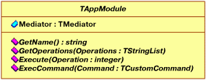 TAppModule владеет ссылкой на медиатор, что позволяет ему обмениваться сообщениями с другими модулями, не зная при этом их конкретной реализации. Такая архитектура делает модуль независимым от всех прочих модулей приложения. При этом каждый модуль сам реализует свой уровень представления (рис.2). Методы GetName и GetOperations позволяют главному модулю TAppConsole получить имя модуля и множество поддерживаемых им функций для формирования интерфейса пользователя TAppConsoleForm. Через метод Execute осуществляется вызов функции модуля с соответствующим порядковым номером. Этот вызов происходит, когда пользователь вызывает пункт меню, соответствующий одной из функций модуля (рис. 4). Метод ExecCommand обеспечивает возможность передачи модулю команды и используется только медиатором, мотивацию существования которого мы и разберем далее.