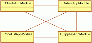 Модули проекта являются носителями бизнес-логики в проекте. Это, к примеру, может быть TOrdersAppModule – логика работы с заказами, TSuppliesAppModule – логика работы с поставками и т.д. Все они наследуются от абстрактного TAppModule, который содержит всю необходимую служебную функциональность (рис.6).
