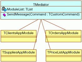Рассмотрим подробнее работу абстрактной фабрики TModuleFactory (листинг 2). Она осведомлена о всех конкретных модулях и способна порождать их экземпляры. Ее единственный метод CreateModule создает модуль заданного типа и назначает ему медиатор. Медиатор используется для связи между модулями - для передачи команд. О его использовании будет сказано ниже.