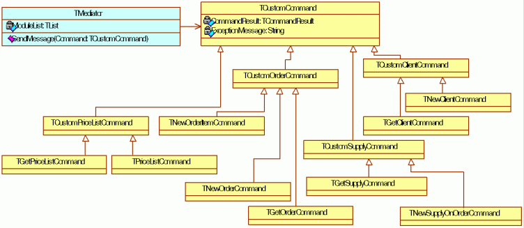 Модуль-отправитель создает объект-команду для модуля-получателя и вызывает метод медиатора SendMessage(TCustomCommand). Медиатор последовательно просматривает все зарегистрированные в нем модули и вызывает их команду ExecCommand(TCustomCommand). Вызываемая процедура Execute поверяет тип команды и или выполняет ее, или отвергает. Команды выполняются в синхронном режиме. Данный подход напоминает паттерн Publisher-Subscriber. На рис. 8 показана структура классов команд и их взаимосвязь с Медиатором.
