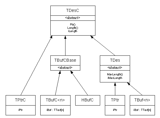 Все эти дескрипторы наследуются от одного базового класса TDesC, в котором определены базовые виртуальные методы Ptr(), Length() и т.д.