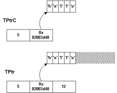 Это два класса: TPtr и TPtrC. TPtrC содержит только длину строки и указатель на ее начало. TPtr содержит также максимальную длину строки, кторая может быть представлена этим дескриптором.