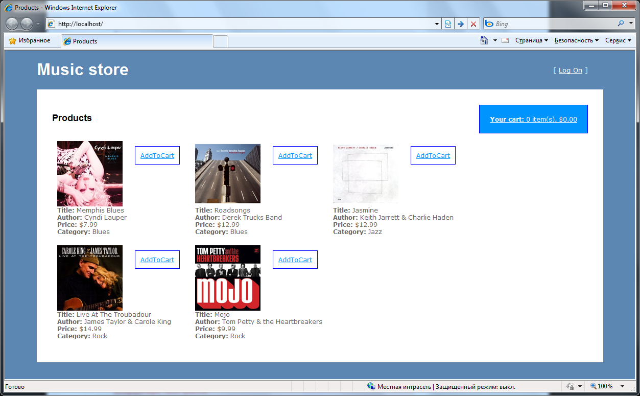 Попробуем собрать всё вместе и написать приёмочные тесты для простейшего сайта на ASP.NET MVC 2. Хотя, как вы увидите позже, тесты никак не зависят от языка, на котором написано Web-приложение. Предположим, что мы разрабатываем музыкальный магазин. Ниже представлен его внешний вид: