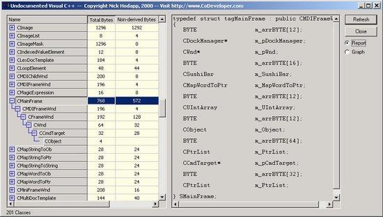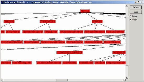 Наконец, ShowInnards имеет два режима отображения. Режим отчетов использует grid-контрол Криса Маундера (Chris Maunder) (с расширением grid-tree от Кена Бертельзона (Ken Bertelson)), чтобы отображать отчет об идентифицированных классах. Для классов, чья внутренняя структура была определена, справа в edit control'е показывается структурное представление раскладки объекта в стиле C. Графический режим показывает всю иерархию классов внутри CScrollView. Я извиняюсь за паршивую раскладку дерева, но я считаю ее достаточной на данный момент.