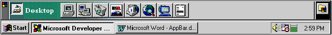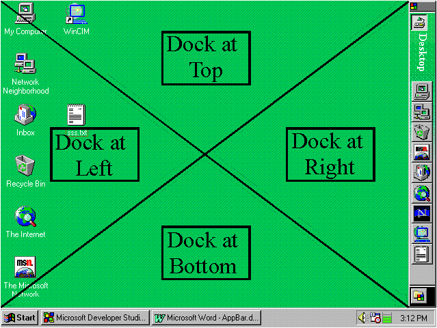 Я решил создать класс, названный мною CAppBar, который бы инкапсулировал все особенности панелей инструментов рабочего стола так, чтобы можно было достаточно просто создавать панели любого типа. Мой класс CAppBar унаследован от CDialog, так что Вы можете легко создавать панели инструментов на основе шаблона диалогового окна.