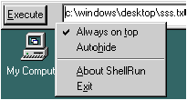 Панель ShellRun тестирует также некоторые дополнительные особенности. Когда Вы щелкаете правой кнопкой мыши на клиентской области основного окна, появляется контекстное меню, как показано на Рисунке 7. Это меню позволяет изменять свойства “Поверх всех окон” и “Автоматически скрывать с экрана”. Также можно вызвать окно информации о программе и завершить приложение.