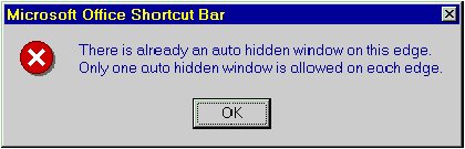 Лично мне нравится это свойство – AutoHide и я всегда включаю его для панели задач оболочки. Обратите внимание на одну важную особенность: оболочка позволяет иметь только одну такую панель на каждом краю экрана (см. Рисунок 2). Оболочка следует этому правилу, т.к. две скрытых панели на одном краю экрана наложились бы друг на друга полностью, что сделало бы невозможным активизацию одной из них. Вы можете провести следующий эксперимент, чтобы увидеть все своими глазами: сначала закрепите панель задач внизу вашего экрана, а панель быстрого запуска Microsoft Office вверху экрана, затем включите свойство AutoHide для обеих этих панелей. Теперь перетащите панель Microsoft Office к нижнему краю Вашего экрана, где расположена панель задач. Появится окно сообщений, показанное на Рисунке 2, и панель быстрого доступа Microsoft Office автоматически отключит у себя свойство AutoHide.