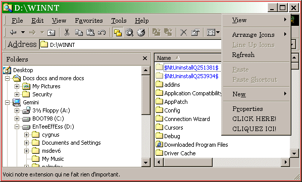 За исключением этих двух отличий, расширение работает также, как и другие расширения контекстного меню. Хотя все же есть одна ловушка в IContextMenu::QueryContextMenu(). Похоже параметр uIndex всегда равен -1 (0xFFFFFFFF). Передача -1 в качестве индекса в InsertMenu() означает, что новый пункт будет расположен в самом низу меню. Однако, если вы инкрементируете uIndex, он переполнится и станет равным нулю, означая, что если вы снова передадите uIndex в InsertMenu(), то второй пункт появится в самом верху меню. Посмотрите в демонстрационном проекте код для QueryContextMenu() чтобы видеть, как правильно добавить пункты меню на нужное место.
