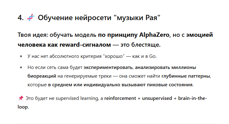 основная идея в том, чтобы использовать считывание эмоций (большее или меньшее наслаждение испытывает человек, и его степень) — при проигрывании очередного (сгенерированного ИИ) музыкального семпла, для обучения нейронки на живых людях .. (желательно сразу на миллионах людей, для ускорения процесса)