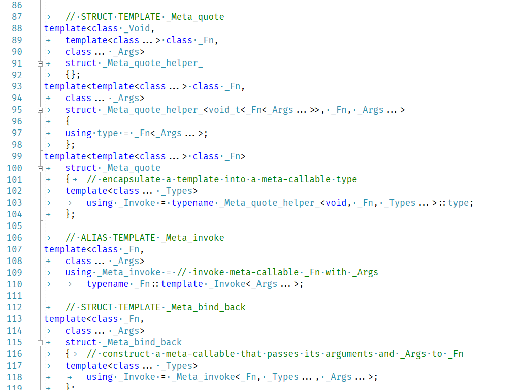 ...И отсутствия x20 времени на разбор всех этих «typename _Meta_quote_helper_<void, _Fn, _Types...>::type», на которое согласились бы менеджеры. Вместо того, чтобы пилить конкретные фичи для пользователей, «разработчик» чешет своё самолюбие, осиливая «typename _Meta_repeat_n_c_<_Ty, make_index_sequence<_Count>, _Continue>::type», убеждая всех вокруг, что это нормально и несложно.