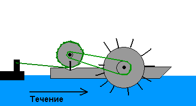 Кораблик, который только за счет энергии течения разгоняется до скорости, превышающей скорость течения. Он привязан за веревку к пристани, вытягивание веревки приводит к раскрутке лопастей. С лопастями проще представлять, чем с винтом.