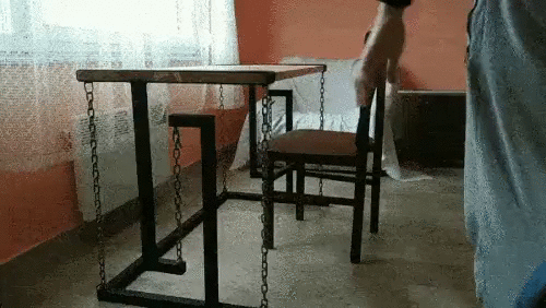 Угловые цепи служат для стабилизации, чтобы столешницв не проворачивалась и не опрокинулась. Соответственно, там везде наверняка люфт в 1-2 звена цепей: столешница хоть и не упадет, но дергаться будет от любого чиха и пука.