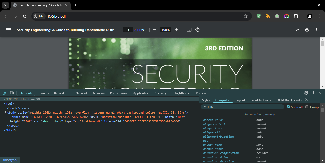Ну вот если теперь вызвать где-нибудь в тексте PDF всплывающее меню и выбрать "Inspect" (Посмотреть код), то там будет тот самый html элемент, который я указал (<embed type="application/x-google-chrome-pdf" src="chrome-extension://...).