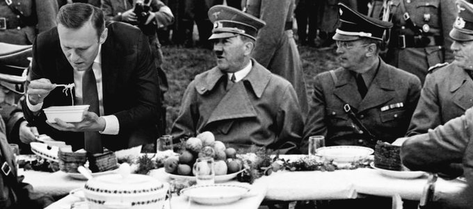 Банкет после подписания акта о капитуляции Германии. Порошенко уже под столом после тоста за Америку с генералом Спаатсом.