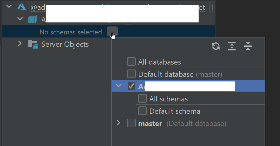 DataGrip 2021.3.3 Попробовал открыть базу на azure, всё вроде хорошо открывает и читает системные таблицы, но ни одной таблицы пользователя не видно. Только показывает "No schemas selected".