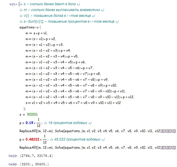 СГ>Собрался в отпуск и решил взять в банке немного денег. Без предъявления справки о доходах, без поручителей, всего за один день, просто по паспорту, в Балтийском банке оказывается можно взять до 30'000 рублей на 12 месяцев, причем даже на пластиковую карточку Visa Electron. Я не нашел больше ни одного другого банка кроме Балтийского, который бы так делал (другие требуют справку о доходах, поручителей, либо предоставляют овердрафт только по своим собственным зарплатным пластиковым картам). Ко всему прочему Балтийский банк за кредит берет всего лишь 19 (девятнадцать!!!) процентов плюс некий небольшой комиссионный сбор. Предложение, на первый взгляд, выглядит очень заманчиво. Исходя из 19 процентов годовых, прикинул сколько будет составлять ежемесячные (равновеликие) выплаты (для суммы в 30'000 руб.) получил 2'764.70 рублей/месяц. Вчера пришел в банк и там выяснилось что в результате всяких комиссионных сборов размер ежемесячной выплаты (для суммы в 30'000 руб.) составляет 3'200 рублей/месяц. Сравните 2'764.70 рублей/месяц и 3'200.00 рублей/месяц в течении 12 месяцев, разницу уже видно невооруженным взглядом. А теперь держитесь. Если пересчитать сумму 3'200.00 рублей/месяц обратно в проценты, т.е. сколько же реально банковских годовых процентов стоит этот кредит вместо рекламируемых 19%, оказывается — 48.222% годовых!