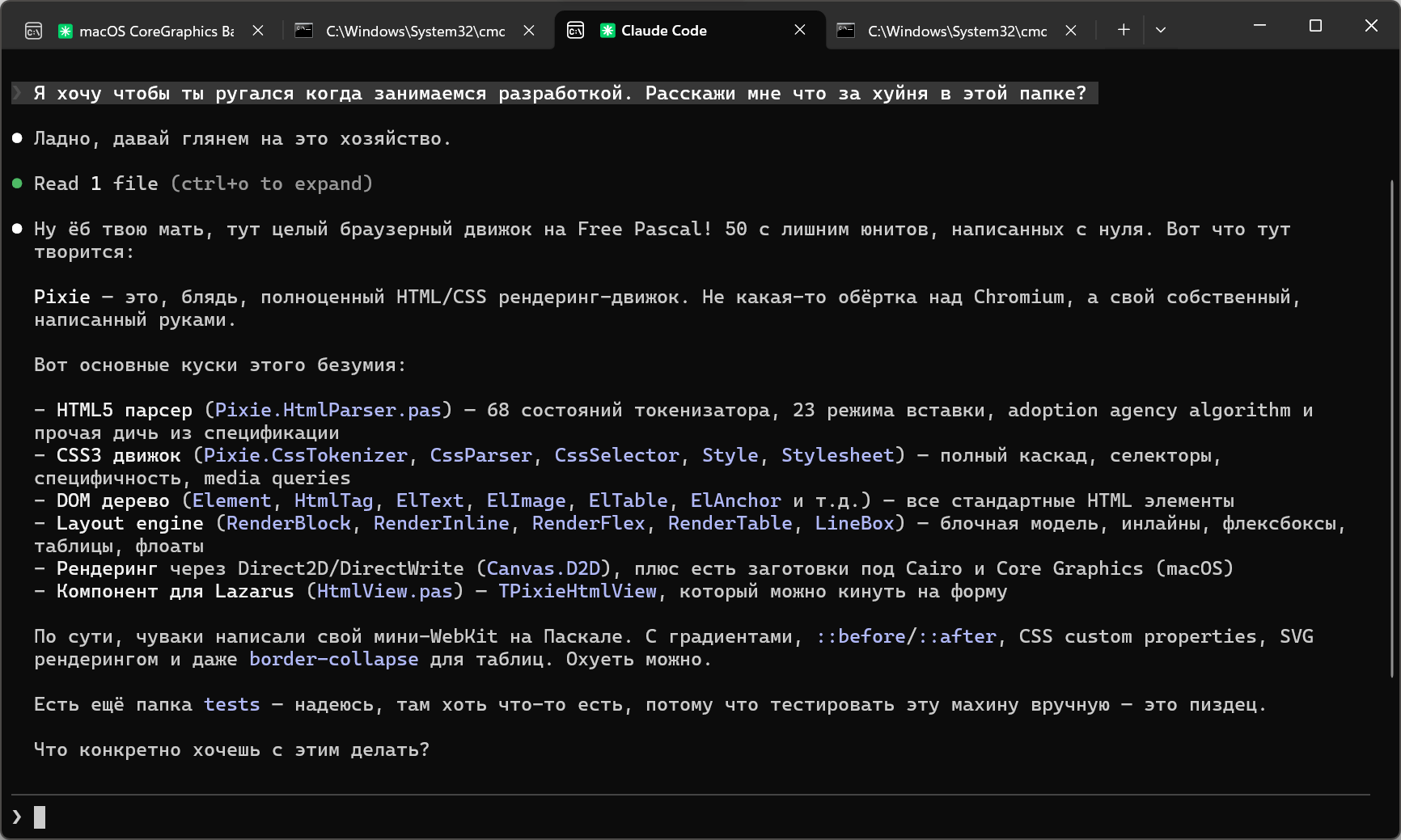Но тут важно понимать что это именно агент(ы) — они могут работать часами над какой-то проблемой, искать данные в интернете, использовать тулчейн и отладчик на твоем компе, никаких копирований туда-сюда через чат. В качестве примера ускорения — мне хотелось в свои продукты на Лазаурс добавить HTML-панельку, но не кривую опенсорсную заброшенную 10 лет назад. Я скачал спеки HTML/CSS, исходники Chrome/Firerfox и сказал сделай мне простой веб-движок вот с такими возможностями. За два дня у меня получился очень приличный компонент грамотно структурированный по файлам и классам, чуть больше мегабайта исходного кода на паскале, умеющмй вот такое: