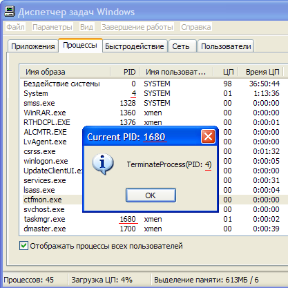На рисунке показан taskmgr. При попытке завершить процесс выдалось сообщение о том, что процесс PID: 1680 (taskmgr.exe) пытается завершить процесс с PID: 4 (System.exe).